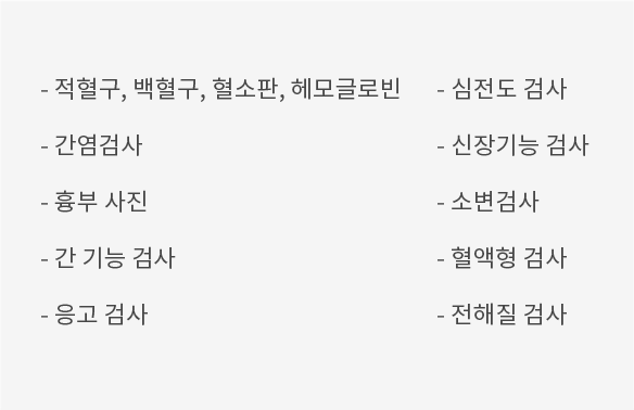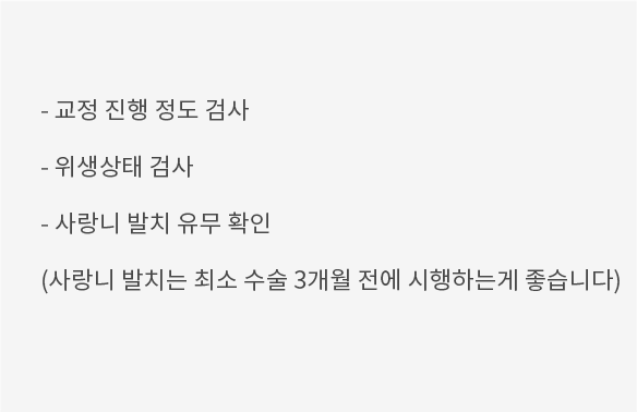 2. ¼ö¼ú Àü °Ë»ç ³»°ú°Ë»ç Àü½Å¸¶Ãë¿¡ ÇÊ¿äÇÑ Àü½Å°Ç° »óŸ¦¼ö¼ú 2~3ÁÖ Àü¿¡ °Ë»ç¸¦ ¹Þ´Â °ÍÀÌ ÁÁ½À´Ï´Ù. ±¸°»óÅÂ°Ë»ç ±³Á¤À̳ª ¹ßÄ¡À¯¹«, ±¸°ÀÇ À§»ý µîÀ» °Ë»çÇÕ´Ï´Ù.